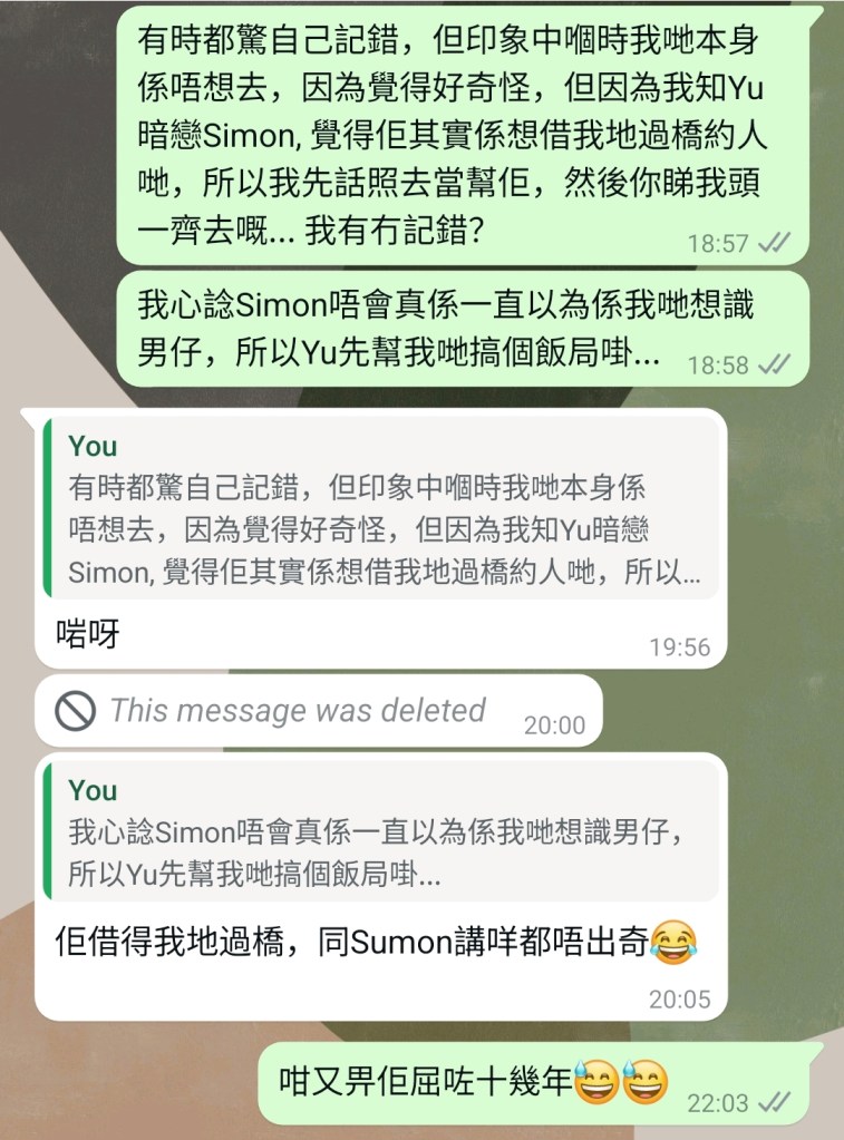 呢件事我一直擺喺心十幾年冇講出嚟,冇同佢對質,同樣係因為唔想揭穿佢令到佢尷尬或老羞成怒,因為知道佢份人好玻璃心,唯有不斷同自己講件事未必係咁,叫自己唔好放喺心,甚至要「感激」佢介紹咗個男仔畀我識… 甚至久而久之,因為gaslight得自己太耐而懷疑自己記錯,懷疑佢利用朋友嘅行為係我自己幻想出嚟,懷疑自己怪錯咗佢,好彩嘅係當時涉事嘅仲有另一位朋友,可以證實確有此事發生過。